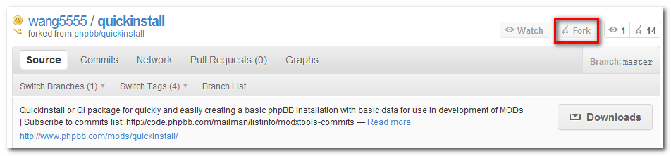 登入 GitHub 官方網站後,瀏覽 phpBB QuickInstall,點選「Fork」。