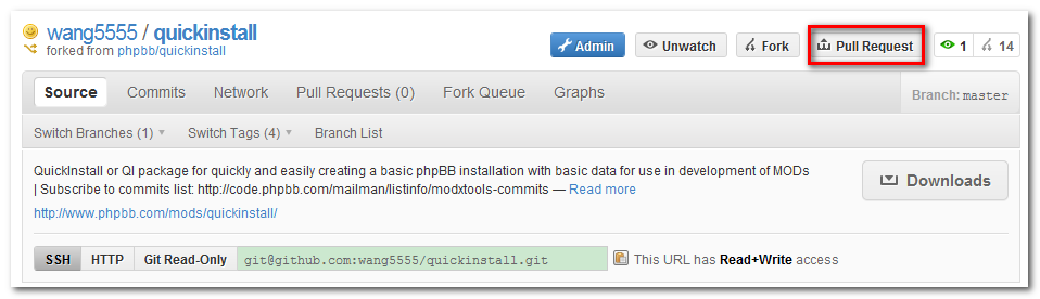 當您完成上傳後,便可以在 wang5555 / quickinstall 點選「Pull Request」。