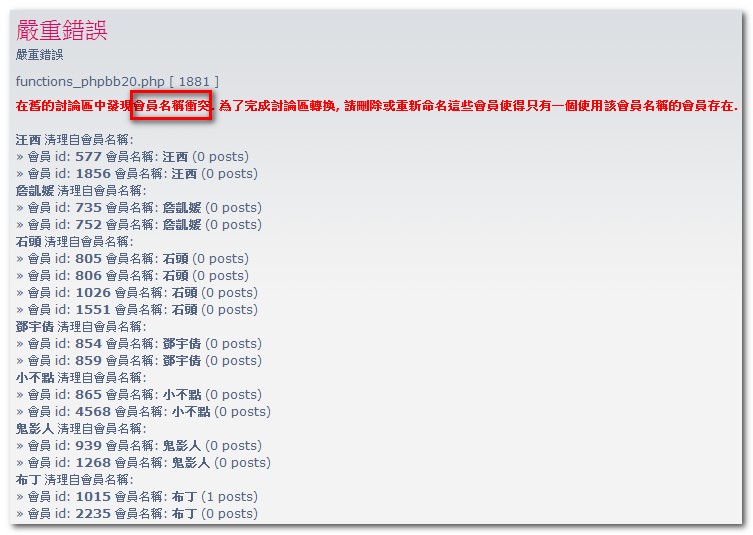 在舊的討論區中發現會員名稱衝突. 為了完成討論區轉換, 請刪除或重新命名這些會員使得只有一個使用該會員名稱的會員存在.