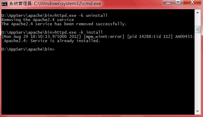 於 DOS 視窗底下,找到 /bin/ 底下 httpd.exe 的位置後,先空一格,再輸入「-k uninstall」後,按「Enter」,即可移除 Apache 服務。